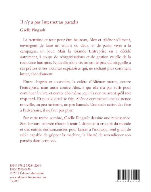 Gentiment bourgeois bohèmes sans être tout à fait dupes, Alex et Aliénor s’aiment, envisagent de faire un enfant ou deux, et de se déconnecter d’un monde qui va trop vite. Mais la Grande Entreprise en a décidé autrement. À coups de réorganisations, elle consomme de l’être humain comme une machine du carburant : sans états d’âme. Entre chagrin et souvenirs, la colère d’Aliénor monte contre l’entreprise, mais aussi contre Alex, à qui son amour n’a pas suffi pour continuer à vivre. Et puis le deuil se fait, Aliénor commence une existence nouvelle, un peu hésitante, avec une seule certitude : face à l’adversaire, il ne faut pas plier. Sans rien masquer de la souffrance de son personnage, l’écriture enlevée, touchante et drôle de Gaëlle Pingault réussit à tenir à distance la cruauté des entités déshumanisées pour laisser à l’individu toute la place, car en continuant à chercher son paradis sur cette Terre et dans cette vie, il est le seul grain de sable capable de gripper la machine.