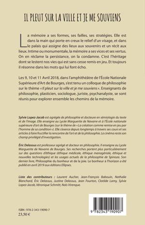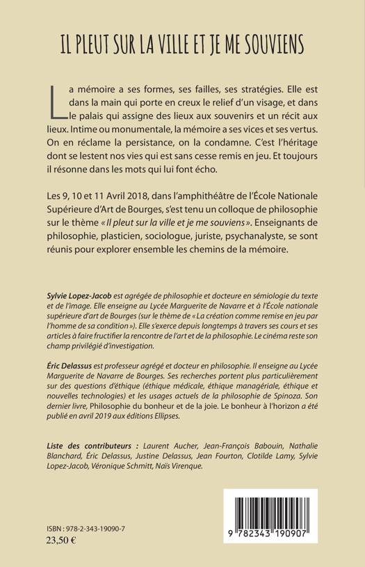 La mémoire a ses formes, ses failles, ses stratégies. Elle est dans la main qui porte en creux le relief d'un visage, et dans le palais qui assigne des lieux aux souvenirs et un récit aux lieux. Intime ou monumentale, la mémoire a ses vices et ses vertues. On en réclame la persistance, on la condamne. C'est l'héritage dont se lestent nos vies qui est sans cesse remis en jeu. Et toujours il résonne dans les mots qui lui font écho.Les 9,10 et 11 avril 2018, dans l'amphithéâtre de l'Ecole Nationale Supérieure d'Art de Bourges, s'est tenu un colloque de philosophie sur le thème "Il pleut sur la ville et je me souviens".