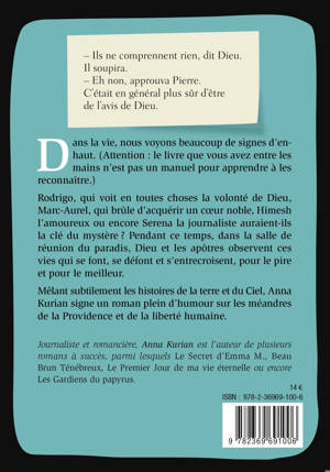 Dans la vie, nous voyons beaucoup de signes d’en-haut. (Attention : ce livre n’est pas un manuel pour apprendre à les reconnaître.) Rodrigo, qui voit en toutes choses la volonté de Dieu, Marc-Aurel, qui brûle d’acquérir un coeur noble, Himesh l’amoureux ou encore Serena la journaliste auraient-ils la clé du mystère ? Pendant ce temps, dans la salle de réunion du paradis, Dieu et les apôtres observent ces vies qui se font, se défont et s’entrecroisent, pour le pire et pour le meilleur. Mêlant subtilement les histoires de la terre et du Ciel, Anna Kurian signe un roman plein d’humour sur les méandres de la Providence et de la liberté humaine.