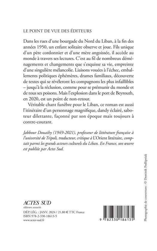 Dans les rues d'une bourgade du Nord du Liban, à la fin des années 1950, un enfant solitaire observe et joue. Fils unique d'un père cordonnier et d'une mère angoissée, il accède au monde à travers ses lectures. C'est au fil de nombreux déménagements et changements que s'esquisse sa vie, empreinte d'une singulière mélancolie. Liaisons vouées à l'échec, emballements politiques éphémères, drames familiaux, découverte de textes qui se révéleront les compagnons les plus infaillibles - jusqu'à la réclusion, comme pour se prémunir du monde et de tous ses poisons. Mais l'explosion dans le port de Beyrouth, en 2020, est un point de non- retour. Véritable chant funèbre pour le Liban, ce roman est aussi l'itinéraire d'un personnage magnifique, dandy éclairé, saboteur dilettante, façonné par son époque mais toujours à contre-courant.