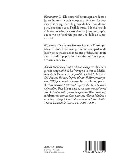 «Ahmed Madani est l'auteur de plusieurs pièces dont »Petit garçon rouge« suivi de »Le Voyage à la mer« et »Méfiez-vous de la Pierre à barbe« publiées en 2001 chez Actes Sud-Papiers. Il a reçu le prix ado du Théâtre contemporain 2015 pour sa pièce »Je marche dans la nuit par un chemin mauvais« (Actes Sud-Papiers, 2014). Il poursuit aujourd'hui Face à leur destin, un cycle théâtral mené avec des habitants des quartiers populaires, »Illumination(s)« et »F(l)ammes« sont les deux premiers. Ahmed Madani a par ailleurs dirigé le Centre dramatique de l'océan Indien à Saint-Denis de la Réunion de 2003 à 2007.»
