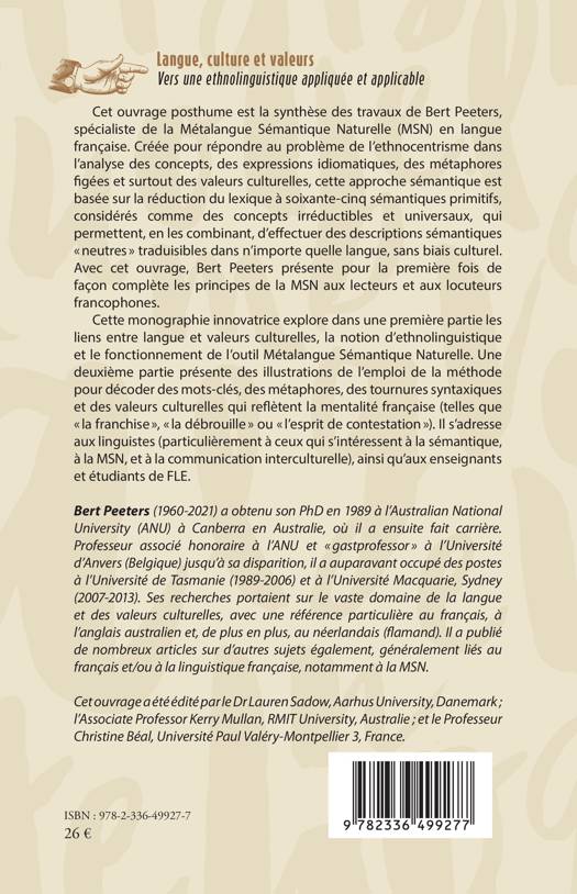 Cet ouvrage posthume est la synthèse des travaux de Bert Peeters, spécialiste de la Métalangue Sémantique Naturelle (MSN) en langue française. Créée pour répondre au problème de l'ethnocentrisme dans l'analyse des concepts, des expressions idiomatiques, des métaphores figées et surtout des valeurs culturelles, cette approche sémantique est basée sur la réduction du lexique à soixante-cinq sémantiques primitifs, considérés comme des concepts irréductibles et universaux, qui permettent, en les combinant, d'effectuer des descriptions sémantiques neutres traduisibles dans n'importe quelle langue, sans biais culturel. Avec cet ouvrage, Bert Peeters présente pour la première fois de façon complète les principes de la MSN aux lecteurs et aux locuteurs francophones.