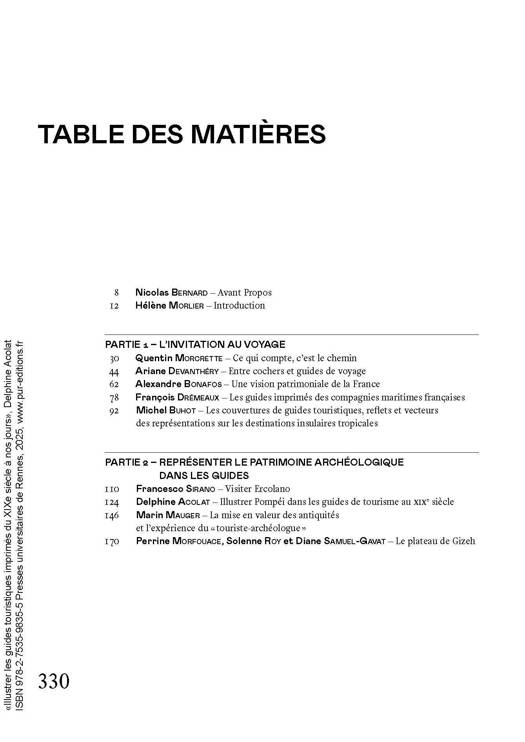 À partir du XIXe siècle, les guides touristiques imprimés se sont affirmés comme le support incontournable de la préparation du voyage : itinéraires, hébergements, visites de sites, ils proposent au lecteur un ensemble de conseils pratiques et d’informations culturelles permettant de préparer le déplacement, le séjour et les visites. Si les premières éditions proposaient des contenus principalement écrits agrémentés de quelques cartes et plans, la part des illustrations n’a cessé de s’accroître et de se diversifier au fil du temps, jusqu’à devenir prédominante dans certains guides contemporains. Cet ouvrage a pour ambition d’interroger la place et le rôle de l’illustration dans l’histoire des guides touristiques imprimés. Il invite à penser la façon dont le recours à l’illustration a évolué avec le temps, les modes d’illustration retenus par les auteurs et les éditeurs, le choix pratique, stratégique et commercial de ces illustrations conduisant parfois à la relégation du texte.