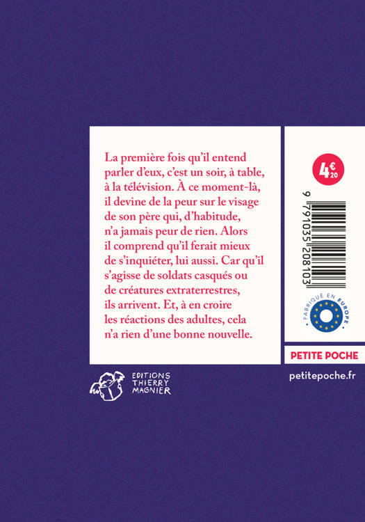 La première fois qu'il entend parler d'eux, c'est un soir, à table, à la télévision. À ce moment-là, il devine de la peur sur le visage de son père qui, d'habitude, n'a jamais peur de rien. Alors il comprend qu'il ferait mieux de s'inquiéter, lui aussi. Car qu'il s'agisse de soldats casqués ou de créatures extraterrestres, ils arrivent. Et, à en croire les réactions des adultes, cela n'a rien d'une bonne nouvelle.