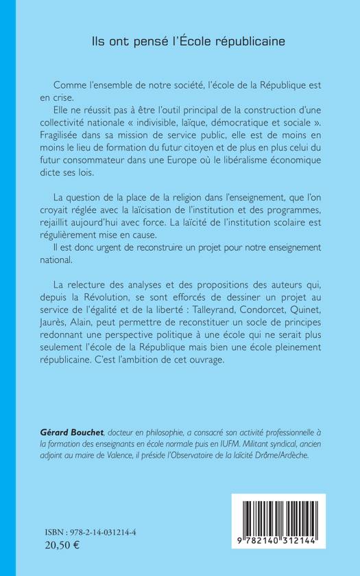 Comme l'ensemble de notre société, l'école de la République est en crise. Elle ne réussit pas à être l'outil principal de la construction d'une collectivité nationale « indivisible, laïque, démocratique et sociale ». Fragilisée dans sa mission de service public, elle est de moins en moins le lieu de formation du futur citoyen et de plus en plus celui du futur consommateur dans une Europe où le libéralisme économique dicte ses lois. La question de la place de la religion dans l'enseignement, que l'on croyait réglée avec la laïcisation de l'institution et des programmes, rejaillit aujourd'hui avec force. La laïcité de l'institution scolaire est régulièrement mise en cause. Il est donc urgent de reconstruire un projet pour notre enseignement national. La relecture des analyses et des propositions des auteurs qui, depuis la Révolution, se sont efforcés de dessiner un projet au service de l'égalité et de la liberté : Talleyrand, Condorcet, Quinet, Jaurès, Alain, peut permettre de reconstituer un socle de principes redonnant une perspective politique à une école qui ne serait plus seulement l'école de la République mais bien une école pleinement républicaine. C'est l'ambition de cet ouvrage.