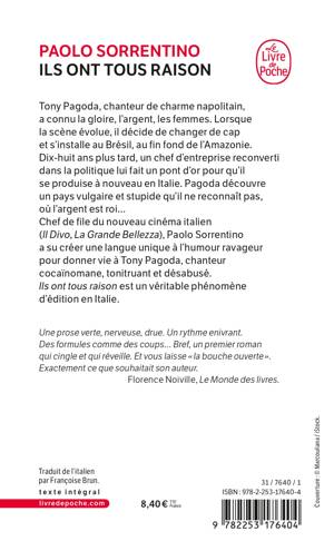 Tony Pagoda, chanteur de charme napolitain, a connu la gloire, l'argent, les femmes. Lorsque la scène évolue, il décide de changer de cap et s’installe au Brésil, au fin fond de l'Amazonie. Dix-huit ans plus tard, un chef d'entreprise reconverti dans la politique lui fait un pont d'or pour qu'il se produise à nouveau en Italie. Pagoda découvre un pays vulgaire et stupide qu’il ne reconnaît pas, où l'argent est roi... Chef de file du nouveau cinéma italien (Il Divo), Paolo Sorrentino a su créer une langue unique à l'humour ravageur pour donner vie à Tony Pagoda, chanteur cocaïnomane, tonitruant et désabusé. Ils ont tous raison est un véritable phénomène d'édition en Italie. Une prose verte, nerveuse, drue. Un rythme enivrant. Des formules comme des coups… Bref, un premier roman qui cingle et qui réveille. Et vous laisse « la bouche ouverte ». Exactement ce que souhaitait son auteur. Florence Noiville, Le Monde des livres.