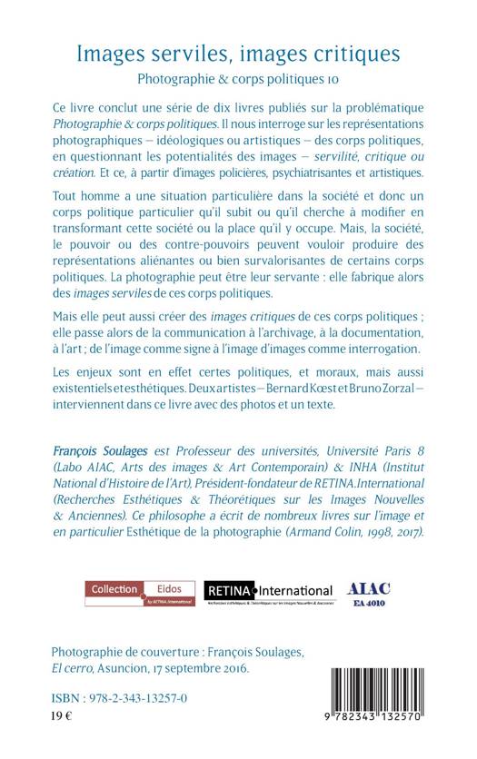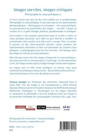 Ce livre conclut une série de dix ouvrages publiés sur la problématique Photographie & corps politiques. Il nous interroge sur les représentations photographiques, idéologiques ou artistiques des corps politiques, en questionnant les potentialités des images - servilité, critique ou création. Et ce, à partir d'images policières, psychiatrisantes et artistiques. Les enjeux sont en effet certes politiques et moraux, mais aussi existentiels et esthétiques. Deux artistes - Bernard Koest et Bruno Zorzal - interviennent dans ce livre pour présenter des photographies.