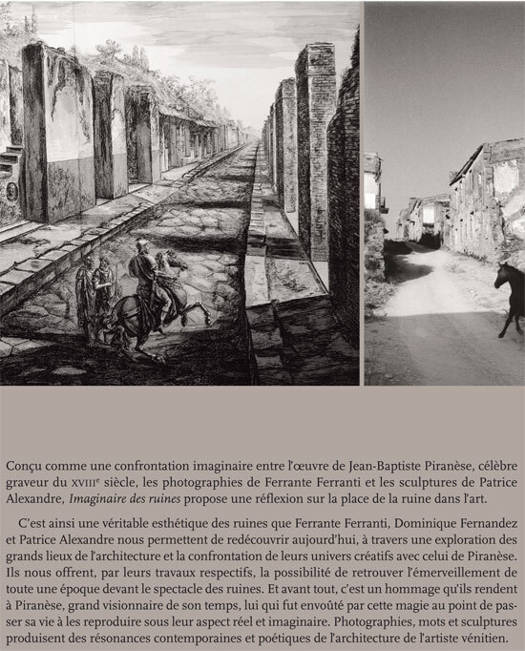 C'est ainsi une véritable esthétique des ruines que Ferrante Ferranti, Dominique Fernandez et Patrice Alexandre nous permettent de redécouvrir aujourd'hui, à travers une exploration des grands lieux de l'architecture et la confrontation de leurs univers créatifs avec celui de Piranèse. Ils nous offrent, par leurs travaux respectifs, la possibilité de retrouver l'émerveillement de toute une époque devant le spectacle des ruines. Et avant tout, c'est un hommage qu'ils rendent à Piranèse, grand visionnaire de son temps, lui qui fut envoûté par cette magie au point de passer sa vie à les reproduire sous leur aspect réel et imaginaire. Photographies, mots et sculptures produisent des résonances contemporaines et poétiques de l'architecture de l'artiste vénitien.
