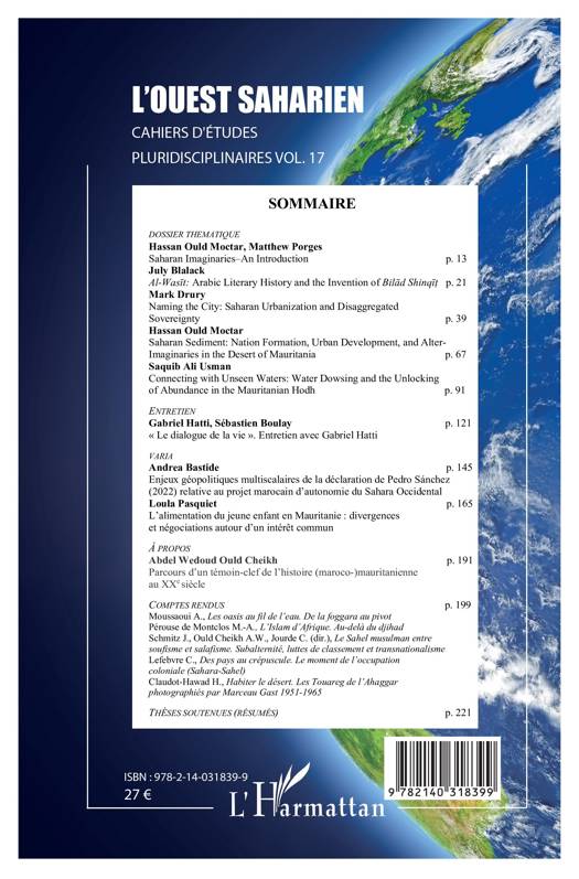 Au sommaire de ce numéro: Al-Wasit: Arabic Literary History and the Invention of Bilad Shinqit; Naming the City: Saharan Urbanization and Disaggregated Sovereignty; Saharan Sediment: Nation Formation, Urban Development, and Alter-Imaginaries in the Desert of Mauritania; Connecting with Unseen Waters: Water Dowsing and the Unlocking of Abundance in the Mauritanian Hodh; Le dialogue de la vie . Entretien avec Gabriel Hatti; Enjeux géopolitiques multiscalaires de la déclaration de Pedro Sánchez (2022) relative au projet marocain d'autonomie du Sahara Occidental; L'alimentation du jeune enfant en Mauritanie: divergences et négociations autour d'un intérêt commun; Parcours d'un témoin-clef de l'histoire (maroco-)mauritanienne au XXe siècle.