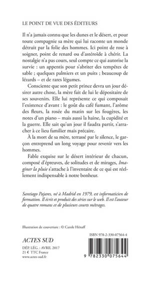 Il n'a jamais connu que les dunes et le désert, et pour toute compagnie sa mère qui lui raconte un monde détruit par la folie des hommes. Ici point de rose à soigner, point de renard ou d'astéroïde à chérir. La nostalgie n'a pas cours, seul compte ce qui autorise la survie : un appentis pour s'abriter des tempêtes de sable ; quelques palmiers et un puits ; beaucoup de lézards - et de rares légumes. Consciente que son petit prince devra un jour désirer autre chose, la mère fait de lui le dépositaire de ses souvenirs. Elle lui représente ce qui composait l'existence d'avant : le goût du café fumant, l'arôme des fleurs, la rosée du matin sur les fougères, les notes d'un piano - mais aussi la haine, la cupidité et la guerre. Elle sait qu'un jour il faudra partir, s'arracher à ce lieu familier mais précaire. À la mort de sa mère, terrassé par le silence, le garçon entreprend un long voyage pour revenir vers les hommes. Fable exquise sur le désert intérieur de chacun, composé d'épreuves, de solitudes et de mirages, «Imaginer la pluie» s'attache à l'inventaire de ce qui est réellement indispensable à notre bonheur.