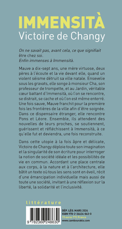 Mauve a dix-sept ans, une mère virtuose, deux pères à l'écoute et la vie devant elle, quand un violent séisme détruit sa ville natale. Ensevelie sous les gravats, elle songe à monsieur Cha, son professeur de trompette, et au Jardin, véritable coeur battant d'Immensità, où l'on se rencontre, se distrait, se cache et où l'on est même enterré. Une fois sauve, Mauve franchit pour la première fois les frontières de la ville afin d'être soignée. Dans ce dispensaire étranger, elle rencontre Pons et Léore. Ensemble, ils attendent des nouvelles de leurs proches, se soutiennent, guérissent et réfléchissent à Immensità, à ce qu'elle fut et deviendra, une fois reconstruite.