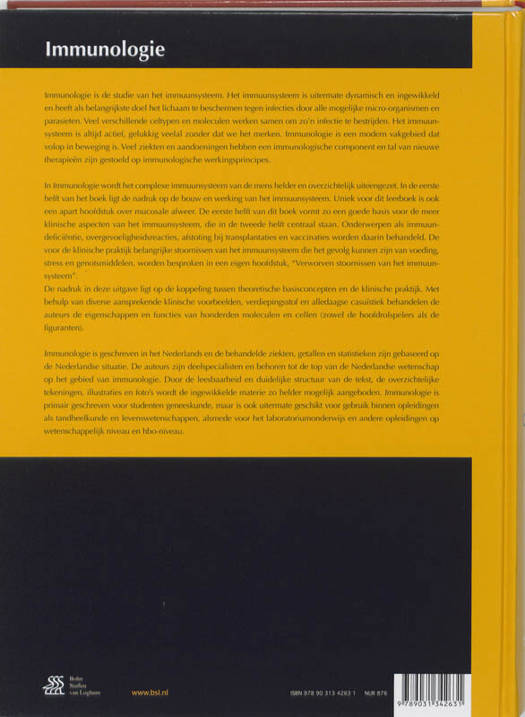 In Immunologie wordt het complexe immuunsysteem van de mens helder en overzichtelijk uiteengezet. In de eerste helft van het boek ligt de nadruk op de bouw en werking van het immuunsysteem. Uniek voor dit leerboek is ook een apart hoofdstuk over mucosale afweer. De eerste helft van dit boek vormt zo een goede basis voor de meer klinische aspecten van het immuunsysteem, die in de tweede helft centraal staan. Onderwerpen als immuundeficiëntie, overgevoeligheidsreacties, afstoting bij transplantaties en vaccinaties worden daarin behandeld. De voor de klinische praktijk belangrijke stoornissen van het immuunsysteem die het gevolg kunnen zijn van voeding, stress en genotsmiddelen, worden besproken in een eigen hoofdstuk, 'Verworven stoornissen van het immuunsysteem'.