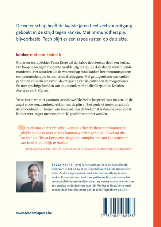 Professor en topdokter Tessa Kerre wil dat taboe doorbreken door een verhaal van hoop te brengen zonder te rooskleurig te zijn. Ze doet dat op verschillende manieren. Met woorden die de wetenschap rond kanker, het immuunsysteem en immunotherapie in mensentaal uitleggen. Met getuigenissen van kankerpatiënten en verhalen vanuit de omgeving van de patiënt en de zorgverlener. En met prachtige beelden van onder andere Nathalie Carpentier, Kristien Aertssen en B. Carrot.