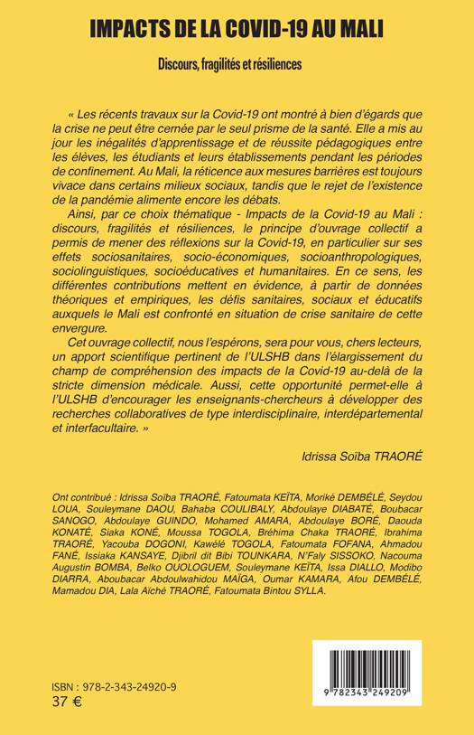 « Les récents travaux sur la Covid-19 ont montré à bien d'égards que la crise ne peut être cernée par le seul prisme de la santé. Ainsi, cet ouvrage collectif a permis de mener des réflexions sur la Covid-19, en particulier sur ses effets sociosanitaires, socio-économiques, socioanthropologiques, sociolinguistiques, socioéducatives et humanitaires. En ce sens, les différentes contributions mettent en évidence, à partir de données théoriques et empiriques, les défis sanitaires, sociaux et éducatifs auxquels le Mali est confronté en situation de crise sanitaire de cette envergure. Idrissa Soïba TRAORÉ