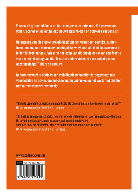 Enscenering haalt cliënten uit hun vastgeroeste patronen. Het werken met rollen, scènes en objecten lokt nieuwe gesprekken en sterkere respons uit. De auteurs van dit sterke praktijkboek openen vanuit een eerlijke, authentieke houding een deur naar hun dagelijks werk met als doel de lezer mee te leiden in deze aanpak. "Als u na het lezen van dit boekje ook maar een fractie van die beïnvloeding aan den lijve zou ondervinden, zijn we volledig in ons opzet geslaagd," aldus de auteurs. In deze herwerkte editie is een volledig nieuw hoofdstuk toegevoegd met voorbeelden en advies om enscenering te gebruiken in het werk met cliënten met autismespectrumstoornis.