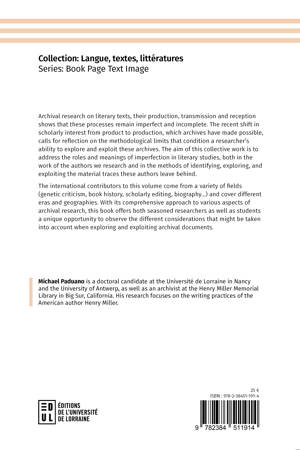 La recherche dans les archives sur les textes littéraires, leur production, transmission et réception montre qu’il s’agit de processus qui restent imparfaits et incomplets. Le déplacement de l’intérêt des chercheurs du texte final vers sa production, que les archives ont rendu possible, appelle à une réflexion sur les limites méthodologiques qui conditionnent la capacité d’un chercheur à explorer et à exploiter ces archives. L’objectif de cet ouvrage collectif est d’aborder le rôle de l’imperfection dans les études littéraires, tant dans l’œuvre des auteurs sur lesquels portent les recherches que dans les méthodes d’identification, d’exploration et d’exploitation de leurs traces matérielles. Les contributeurs internationaux à cet ouvrage sont issus de domaines variés (critique génétique, histoire du livre, édition savante, biographie…) et couvrent divers époques et espaces géographiques. Par son approche globale des différents aspects de la recherche archivistique, ce livre offrira aux chercheurs expérimentés comme aux étudiants une occasion unique d’observer les différentes considérations qui peuvent être prises en compte lors de l’exploration et de l’exploitation des documents d’archives.
