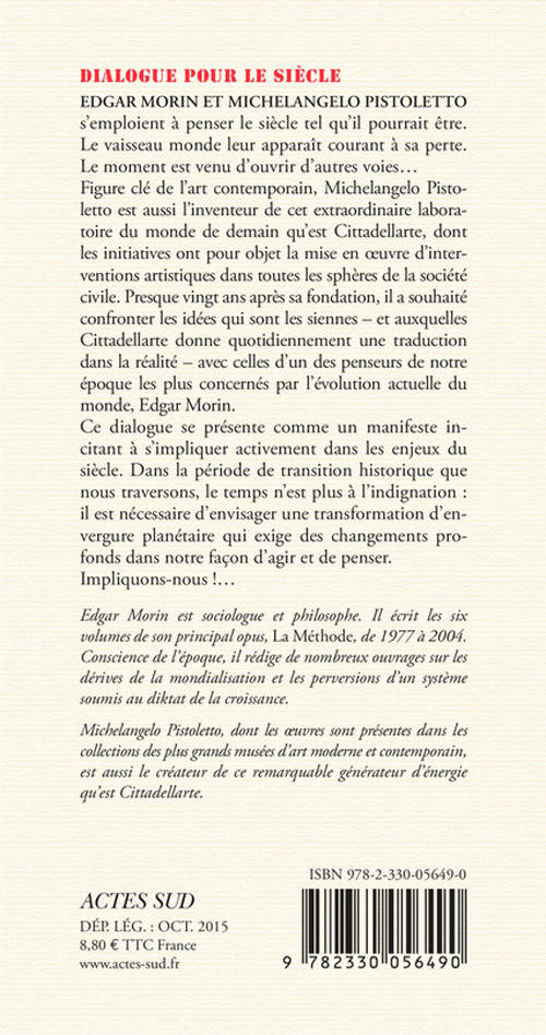 Figure clé de l'art contemporain, Michelangelo Pistoletto est aussi l'inventeur de cet extraordinaire laboratoire du monde de demain qu'est Cittadellarte, dont les initiatives ont pour objet la mise en oeuvre d'interventions artistiques dans toutes les sphères de la société civile. Presque vingt ans après sa fondation, il a souhaité confronter les idées qui sont les siennes - et auxquelles Cittadellarte donne quotidiennement une traduction dans la réalité - avec celles d'un des penseurs de notre époque les plus concernés par l'évolution actuelle du monde, Edgar Morin.