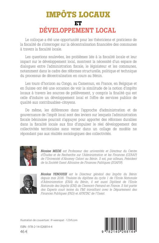 Les auteurs s'interrogent sur la décentralisation financière des communes à travers la fiscalité locale. Les questions soulevées, les problèmes liés à la fiscalité locale et leur impact sur le développement local, montrent la nécessité d'un espace de dialogues entre l'administration fiscale, le législateur et les communes, notamment dans le cadre des réformes structurelle, politique et technique du processus de décentralisation en cours au Bénin. Les tours d'horizon au Congo, au Cameroun, en France, en Belgique et en Suisse ont été une occasion de voir la similitude de la notion d'impôts locaux à travers les sources de prélèvement, y compris la finalité qui est celle d'induire un développement local et l'offre de services publics de qualité aux contribuables-citoyens.