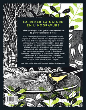 Créez vos tirages d’art grâce à cette technique de gravure accessible à tous ! Dans ce magnifique livre où se mêlent les sujets inspirés du monde naturel, Jane Spink partage son processus de travail pour créer 10 projets imprimés en linogravure. Parcourez les modèles pas-à-pas, depuis leurs croquis initiaux jusqu’aux superbes photographies des empreintes obtenues, pour apprendre à faire apparaître — à la main, avec des tampons ou sous une presse — des oiseaux, des fleurs, des feuillages et d’autres formes ou motifs artistiques. À la fin du livre, vous trouverez des gabarits à utiliser directement sur le support de votre choix (linoléum, PVC, vinyle).
