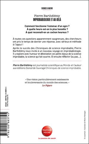 Comment fonctionne l’estomac d’un ogre ? À quelle heure est-on le plus honnête ? À quoi reconnaît-on un cochon heureux ? À toutes ces questions apparemment saugrenues, des chercheurs ont pris le temps de donner une réponse, avec sérieux et méthode à l’appui ! Après le succès des Chroniques de science improbable, Pierre Barthélémy nous invite à un nouveau voyage en improbablologie. Il y explore avec humour et délectation ces petits bijoux de la science improbable, la science qui fait sourire. Et ensuite réfléchir (ou pas…).