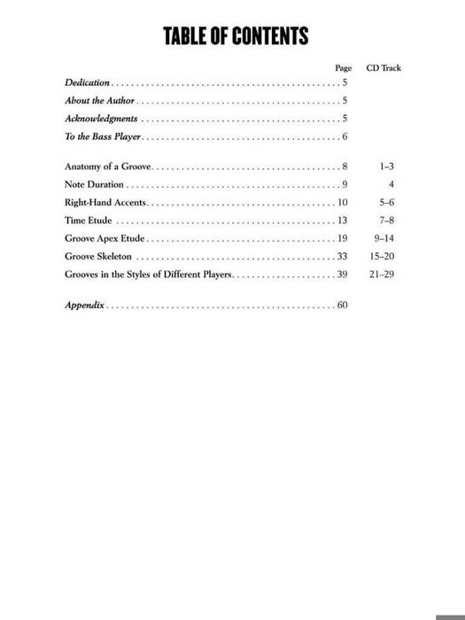 (Bass Instruction). Join acclaimed bassist, composer and teacher Patrick Pfeiffer as he explores the anatomy of a bass groove from the inside out. You'll learn to dissect each groove and discover what makes it so groovy from its skeleton to its apex while evolving your playing skills and musicality along the way. Plenty of exercises and tons of groove ideas will put you in the pocket in no time. The companion CD includes full-band demo tracks of many of the examples in the book.