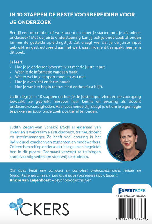 Judith legt je in 10 stappen uit hoe je de juiste input vindt en de voortgang bewaakt. Ze gebruikt hiervoor haar kennis en ervaring als docent onderzoeksvaardigheden. Haar coachende stijl daagt je uit om je eigen regie te pakken en jouw onderzoek positief af te ronden.