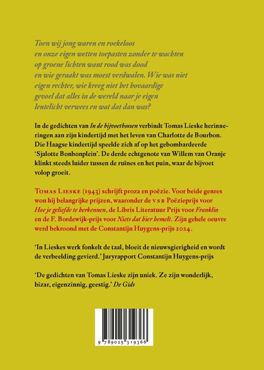 In de gedichten van In de bijvoetbossen verbindt Tomas Lieske herinneringen aan zijn kindertijd met het leven van Charlotte de Bourbon. Die Haagse kindertijd speelde zich af op het gebombardeerde ‘Sjalotte Bonbonplein’. De derde echtgenote van Willem van Oranje klinkt steeds luider tussen de ruïnes en het puin, waar de bijvoet volop groeit.