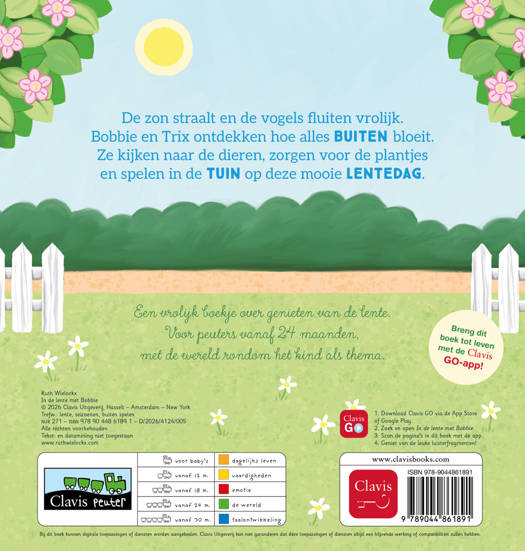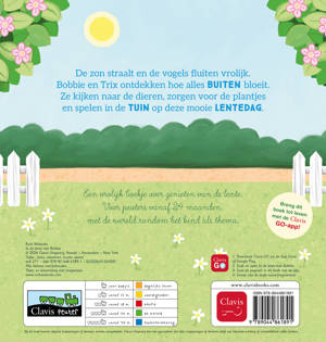 De zon straalt en de vogels fluiten vrolijk. Bobbie en Trix ontdekken hoe alles buiten bloeit. Ze kijken naar de dieren, zorgen voor de plantjes en spelen in de tuin op deze mooie lentedag. Een vrolijk boekje over genieten van de lente. Voor peuters vanaVoor vanaf 2f 24 maanden, met de wereld rondom het kind als thema.