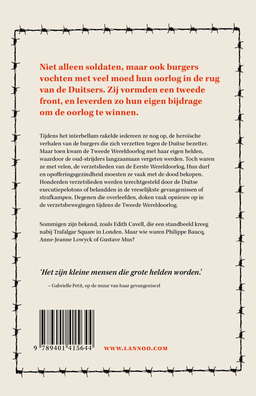 Verbijsterend boek over de weerstand tijdens 1914-1918 In door Duitsers bezet gebied werd tijdens WO I een tweede front gevormd door moedige burgers, die al het mogelijke deden om de geallieerden te helpen. Hun spionage- en sabotagebelevenissen lezen als een trein. Sommigen zijn bekend zoals Edith Cavell, die een standbeeld kreeg nabij Trafalgar Square in Londen. Maar wie waren Philippe Baucq, Anna-Jeanne Lowyck of Louise de Bettignies? Honderden stierven voor de Duitse executiepelotons of belandden in strafkampen. Vaak werden ze verklikt door infiltranten van eigen volk. Degenen die wél overleefden, doken vaak opnieuw op in de verzetsbewegingen tijdens WO II.