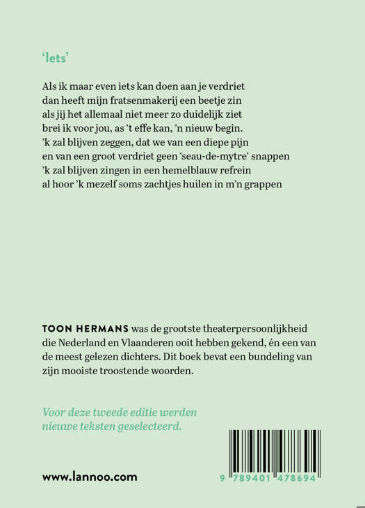 Wat maakte Toon Hermans uniek? Waarom verkozen de lezers van De Telegraaf hem in 1999, een jaar voor zijn dood, tot 'artiest van de eeuw'? Omdat hij hele generaties onbedaarlijk heeft doen lachen en diep ontroerd. Omdat hij het dagelijkse bestaan zo spits en vrolijk wist te relativeren, met pretentieloze grapjes, versjes en liedjes. Omdat hij zo dicht bij ons leek te staan, als een vriend van het huis. Maar hoe populair Toon ook was als theaterman, het zouden wel eens zijn geschriften kunnen zijn die de komende generaties zullen onthouden en bewonderen. Vooral de verzen van Toon blijven mateloos populair. Het zal nog eeuwen duren voor die allemaal uit het gezichtsveld en de culturele canon van de Lage Landen verdwenen zullen zijn.
