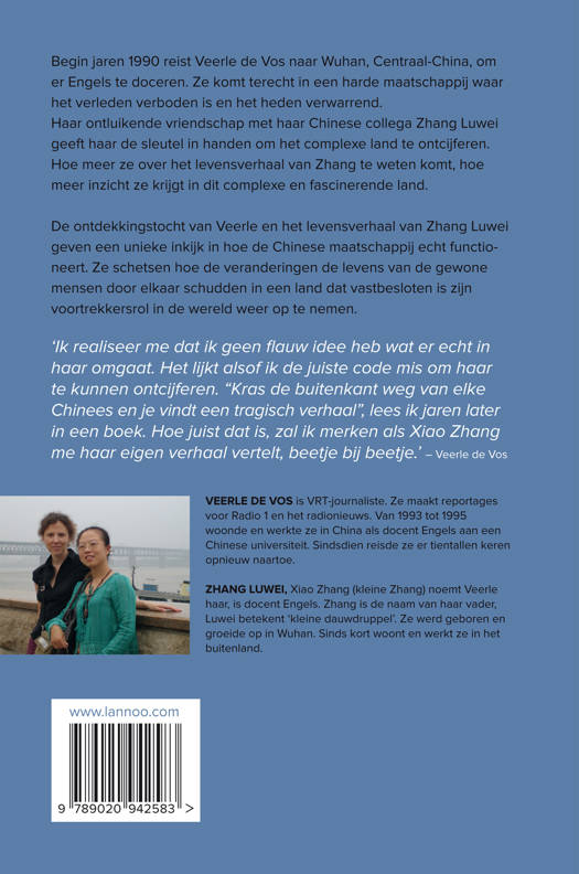 Een intiem portret van China door een Vlaamse en Chinese auteur Een 'dubbele' kijk op het moderne China én een verhaal van een vriendschap die culturele grenzen overschrijdt. Begin jaren 1990 reist journaliste Veerle De Vos naar Wuhan, een stad aan de Yangtze, om er Engels te doceren. Ze komt terecht in een harde maatschappij waar het verleden verboden is en het heden verwarrend. Haar ontluikende vriendschap met een Chinese collega Zhang Luwei geeft haar de sleutel in handen om dit complexe land te ontcijferen. Hoe meer ze over haar levensverhaal te weten komt, hoe beter de puzzelstukken in elkaar vallen. Ze worden vriendinnen voor het leven. De twee levensverhalen worden om elkaar heen gevlochten en geven de lezer beetje bij beetje meer inzicht in hoe de Chinese maatschappij echt functioneert en hoe vastbesloten het land is om zijn voortrekkersrol in de wereld weer op te nemen.