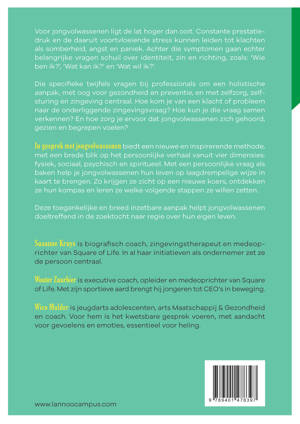 In gesprek met jongvolwassenen biedt een nieuwe en inspirerende methode, met een brede blik op het persoonlijke verhaal vanuit vier dimensies: fysiek, sociaal, psychisch en spiritueel. Met een persoonlijke vraag als baken help je jongvolwassenen hun leven op laagdrempelige wijze in kaart te brengen. Zo krijgen ze zicht op een nieuwe koers, ontdekken ze hun kompas en leren ze welke volgende stappen ze willen zetten.