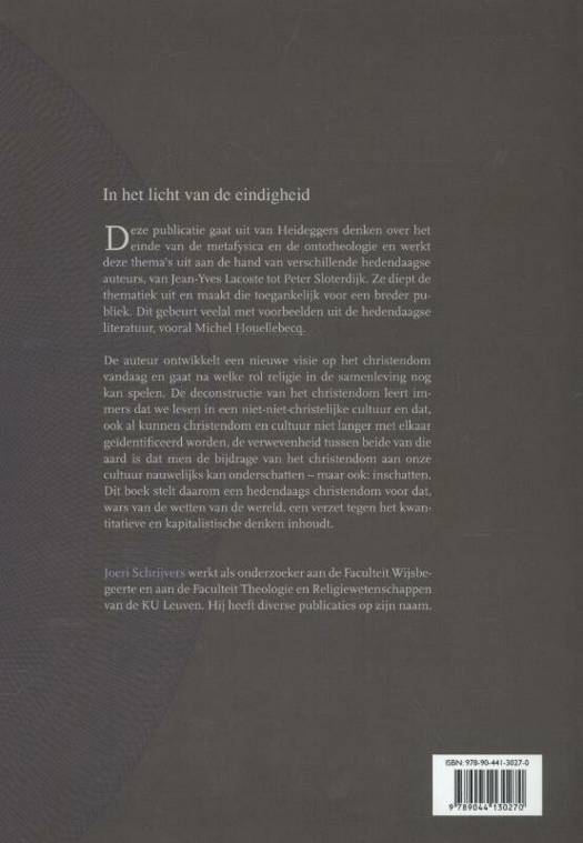 Deze publicatie gaat uit van Heideggers denken over het einde van de metafysica en de ontotheologie en werkt deze thema’s uit aan de hand van verschillende hedendaagse auteurs, van Jean-Yves Lacoste tot Peter Sloterdijk. Ze diept de thematiek uit en maakt die toegankelijk voor een breder publiek. Dit gebeurt veelal met voorbeelden uit de hedendaagse literatuur, vooral Michel Houellebecq.