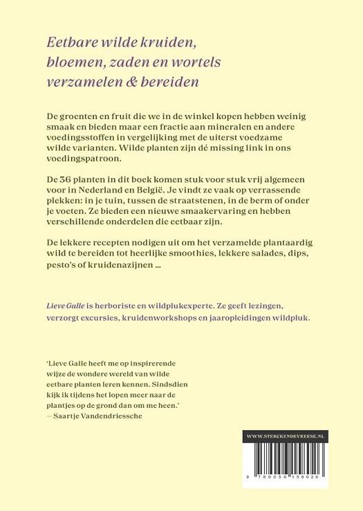 De groenten en fruit die we in de winkel kopen hebben weinig smaak en bieden een fractie aan mineralen en andere voedingsstoffen in vergelijking met de uiterst voedzame wilde varianten. Wilde planten zijn dé missing link in ons voedingspatroon. De 36 planten in dit boek komen stuk voor stuk vrij algemeen voor in Nederland en België. Je vindt ze vaak op verrassende plekken: in je tuin, tussen de straatstenen, in de berm of onder je voeten. Ze bieden een nieuwe smaakervaring en hebben verschillende onderdelen die eetbaar zijn. Maar planten in de natuur plukken betekent zoveel meer dan enkel een smaakbom boordevol voedingsstoffen verzamelen. Het is een zintuiglijk avontuur. Je brengt meer tijd door in de buitenlucht, voelt de zon op je huid, je hoort de vogels zingen, je ruikt de aarde en de bloemen. Je voelt je verbonden, deel van het grote geheel. De lekkere recepten nodigen uit om het verzamelde plantaardig wild te bereiden tot heerlijke smoothies, lekkere salades, dips, pesto’s of kruidenazijntjes …