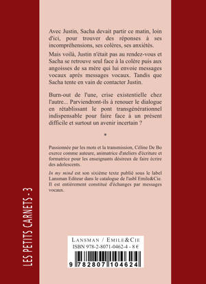 Avec Justin, Sacha devait partir ce matin, loin d'ici, pour trouver des réponses à ses incompréhensions, ses colères, ses anxiétés. Mais voilà, Justin n'était pas au rendez-vous et Sacha se retrouve seul face à la colère puis aux angoisses de sa mère qui lui envoie messages vocaux après messages vocaux. Tandis que Sacha tente en vain de contacter Justin. Burn-out de l'une, crise existentielle chez l'autre… Parviendront-ils à renouer le dialogue en rétablissant le pont transgénérationnel indispensable pour faire face à un présent difficile et surtout un avenir incertain ?