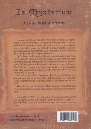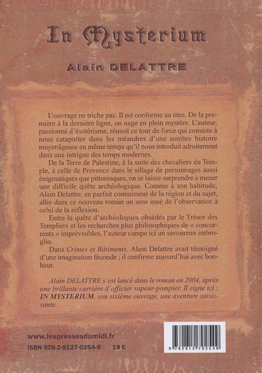 L’ouvrage ne triche pas. Il est conforme au titre. De la première à la dernière ligne, on nage en plein mystère. L’auteur passionné d’ésotérisme, réussit ce tour de force qui consiste à nous catapulter dans les méandres d’une sombre histoire moyenâgeuse en même temps qu’il nous introduit adroitement dans une intrigue des temps modernes. De la Terre de Palestine, à la suite des chevaliers du Temple, à celle de Provence dans le sillage de personnages aussi énigmatiques que pittoresques, on se laisse surprendre à mener une difficile quête archéologique.