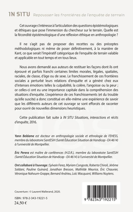 Cet ouvrage s'intéresse à l'articulation des questions épistémologiques et éthiques que pose l'immersion du chercheur sur le terrain. Quelle est la fécondité épistémologique d'une réflexion éthique en anthropologie ? Il ne s'agit pas de proposer des recettes ou des préceptes méthodologiques ni même de poser définitivement, à la manière de Kant, ce que l'impératif catégorique de l'enquête de terrain valable et applicable en tout temps et en tous lieux. Cette publication fait suite à IN SITU Situations, interactions et récits d'enquête, 2016.