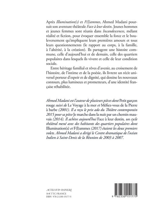 Après «Illumination(s)» et «F(l)ammes», Ahmed Madani poursuit son aventure théâtrale «Face à leur destin». Jeunes hommes et jeunes femmes sont réunis dans «Incandescences», mêlant réalité et fiction, pour évoquer ensemble la force et le bouleversement qu'impliquent leurs premières amours et tous leurs questionnements (le rapport au corps, à la famille, à l'altérité, à la création). Ils partagent une histoire commune, celle d'aujourd'hui et de demain, celle des quartiers populaires dans lesquels ils vivent et celle de leur condition sociale. Entre héritage familial et rêves d'avenir, au croisement de l'histoire, de l'intime et de la poésie, ils livrent un récit universel porteur d'espoir et de dignité, qui dessine les nouveaux contours, plus lumineux et prometteurs, d'une identité française réhabilitée.