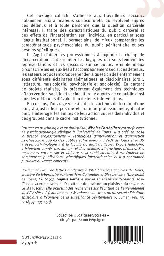 Cet ouvrage collectif s'adresse aux travailleurs sociaux, notamment aux animateurs socioculturels, qui évoluent auprès des détenus et à toute personne que la question carcérale intéresse. Il traite des caractéristiques du public carcéral et des effets de l'incarcération sur l'individu, en particulier sous l'angle institutionnel. Il permet ainsi de mieux les caractéristiques pshychosociales du public pénitentiaire et ses besoins spécifiques.
