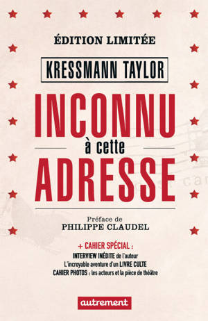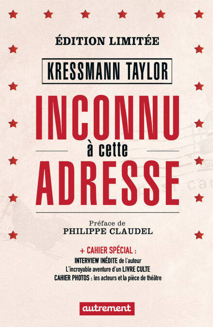 Ils sont tous deux allemands. L’un est juif, l’autre non, et leur amitié semble indéfectible. Ils s’expatrient pour fonder ensemble une galerie d’art en Californie, mais, en 1932, Martin rentre en Allemagne. Au fil de leurs échanges épistolaires, Max devient le témoin impuissant d’une contamination morale sournoise et terrifiante : Martin semble peu à peu gagné par l’idéologie du IIIe Reich. Le sentiment de trahison est immense ; la tragédie ne fait que commencer…Ce texte d’une force inouïe, au dénouement lumineux, a connu un succès instantané lors de sa parution aux États-Unis en 1938 dans le magazine Story. Redécouvert soixante ans plus tard grâce à la publication par Autrement de la traduction française, qui s’est écoulée à un demi-million d’exemplaires, il est aujourd’hui considéré comme un classique du XXe siècle. Pour leur 40e anniversaire, les éditions Autrement rééditent ce roman dans une édition limitée et enrichie : photos, témoignages et documents inédits mettent à jour les secrets d’un classique contemporain. • Le texte intégral dans une traduction révisée ; • Préface de Philippe Claudel, lauréat du prix Renaudot 2003 pour Les Âmes grises ; • L’incroyable destin d’un livre culte ; • Documents et photos d’archives inédits ; • Kathrine Kressmann Taylor, une vie romanesque ; • Interviews inédites de l’auteur et de son fils C. Douglas Taylor ; • Le succès de la pièce de théâtre raconté par Delphine de Malherbe, metteur en scène, Laurent Ruquier et Jean-Marc Dumontet, directeurs du Théâtre Antoine ; • Cahier photos des duos d’acteurs ayant porté le roman sur les planches.
