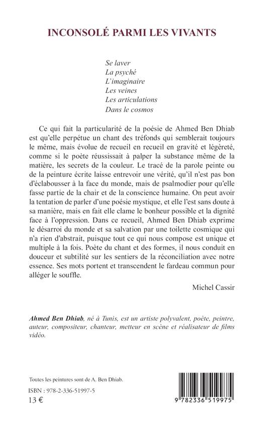 Ce qui fait la particularité de la poésie de Ahmed Ben Dhiab est qu'elle perpétue un chant des tréfonds qui semblerait toujours le même, mais évolue de recueil en recueil en gravité et légèreté, comme si le poète réussissait à palper la substance même de la matière, les secrets de la couleur. Le tracé de la parole peinte ou de la peinture écrite laisse entrevoir une vérité, qu'il n'est pas bon d'éclabousser à la face du monde, mais de psalmodier pour qu'elle fasse partie de la chair et de la conscience humaine.