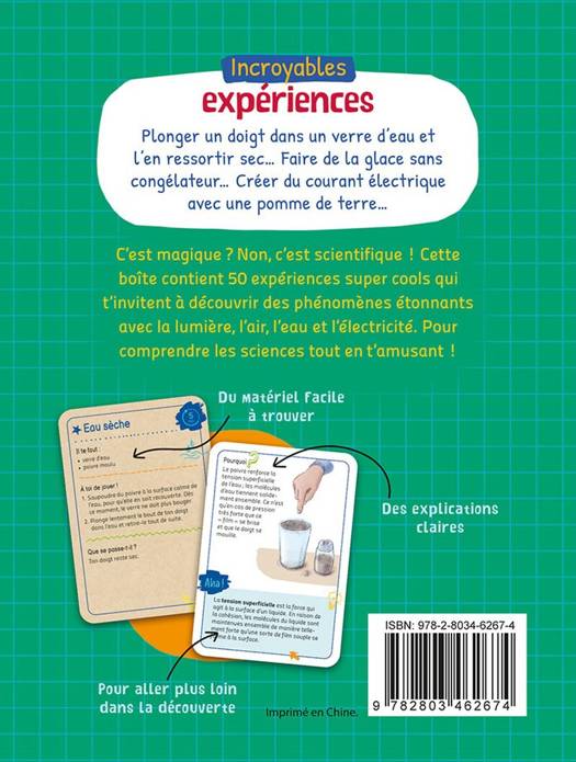 Plonger un doigt dans un verre d'eau et l'en ressortir sec... Faire de la glace sans congélateur... Cette boîte contient 50 expériences super cools qui t'invitent à découvrir des phénomènes étonnants avec de la lumière, de l'air, de l'eau et de l'électricité. Le matériel est facile à trouver et les explications claires te permettent de comprendre les sciences tout en t'amusant !