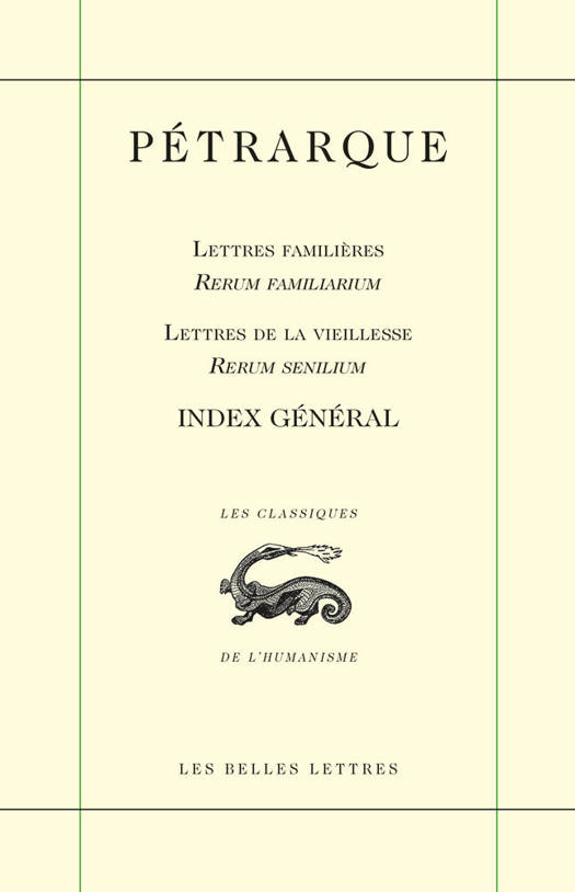 Cet index vient genereusement guider l'imposant massif de la correspondance de Petrarque, d'abord parue dans la collection Classiques de l'humanisme (en deux series, les Lettres de la vieillesse et les Lettres familieres, respectivement de 5 et 6 tomes chacune) et a present disponible, de maniere selective, dans la collection Editio Minor.