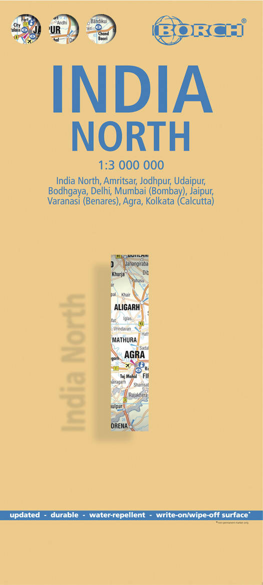 Our soft-laminated folded map of India North in the 6th edition shows: India North 1:3 000 000, Delhi 1:30 000, Mumbai 1:30 000, Kolkata 1:30 000, Jaipur 1:30 000, Agra 1:30 000, Varanasi 1:30 000, Amritsar 1:30 000, Jodhpur 1:30 000, Udaipur 1:30 000, Bodhgaya 1:15 000 and India administrative and time zones. Borch maps are easy to fold, durable and water-repellent with a wipeable surface. Borch Maps show hotels, museums, monuments, markets, public transport, top sights and points of interest, useful statistics, conversion charts for temperatures, weights and measurements, climate charts showing temperatures, sunshine hours, precipitation and humidity, overview maps, time zones, and much more...