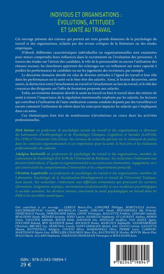 Cet ouvrage présente des travaux qui portent sur trois grands domaines de la psychologie du travail et des organisations, éclairés par des revues critiques de la littérature ou des études empiriques. Une première partie porte le regard sur des individus dans des contextes de recrutement et dans les performances au travail. Le deuxième domaine abordé est celui de diverses attitudes à l'égard du travail et leur rôle dans les performances ou le bien-être des salariés. Enfin, l'ouvrage aborde les différentes facettes de la santé au travail ou bien le travail dans des métiers de santé à travers l'importance de la régulation émotionnelle employée par les salariés, les facteurs qui contribue à l'utilisation de l'auto-médication comme conduite dopante par des travailleurs et encore comment l'utilisation de robots dans les soins peut impacter les salariés.