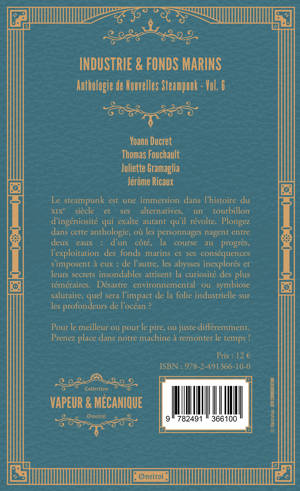 Le steampunk est une immersion dans l’histoire du XIXe siècle et ses alternatives, un tourbillon d’ingéniosité qui exalte autant qu’il révolte. Plongez dans cette anthologie, où les personnages nagent entre deux eaux : d’un côté, la course au progrès, l’exploitation des fonds marins et ses conséquences s’imposent à eux ; de l’autre, les abysses inexplorés et leurs secrets insondables attisent la curiosité des plus téméraires. Désastre environnemental ou symbiose salutaire, quel sera l’impact de la folie industrielle sur les profondeurs de l’océan ? Pour le meilleur ou pour le pire, ou juste différemment. Prenez place dans notre machine à remonter le temps !