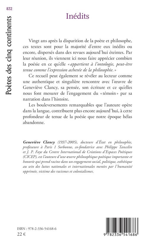 Vingt ans après la disparition de la poète et philosophe, ces textes sont pour la majorité d'entre eux inédits ou encore, dispersés dans des revues aujourd'hui éteintes. Par leur réunion, ils viennent ici nous faire apprécier combien la poésie en ce qu'elle appartient à l'ontologie, peut-être tenue comme l'expression achevée de la philosophie. Ce recueil peut également se révéler au lecteur comme une authentique et singulière rencontre avec l'oeuvre de Geneviève Clancy, sa pensée, son écriture et ce qu'elles nous font mesurer de l'engagement du témoin par sa narration dans l'histoire. Les bouleversements remarquables que l'auteure opère dans la langue, contribuent plus encore aujourd'hui, à cette profondeur de tenue de la poésie que notre époque hélas abandonne.