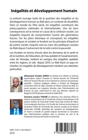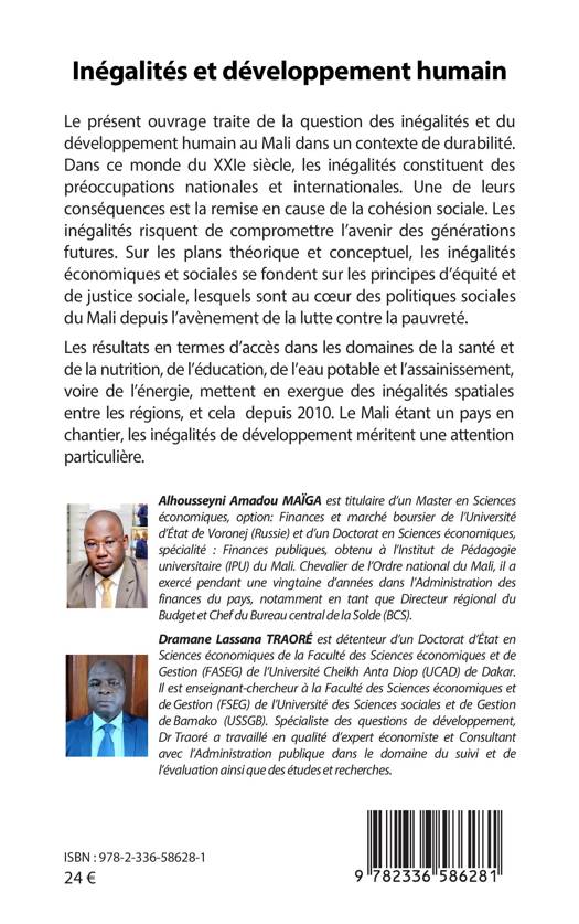 Le présent ouvrage traite de la question des inégalités et du développement humain au Mali dans un contexte de durabilité. Dans ce monde du XXIe siècle, les inégalités constituent des préoccupations nationales et internationales. Une de leurs conséquences est la remise en cause de la cohésion sociale. Les inégalités risquent de compromettre l'avenir des générations futures. Sur les plans théorique et conceptuel, les inégalités économiques et sociales se fondent sur les principes d'équité et de justice sociale, lesquels sont au coeur des politiques sociales du Mali depuis l'avènement de la lutte contre la pauvreté. Les résultats en termes d'accès dans les domaines de la santé et de la nutrition, de l'éducation, de l'eau potable et l'assainissement, voire de l'énergie, mettent en exergue des inégalités spatiales entre les régions, et cela depuis 2010. Le Mali étant un pays en chantier, les inégalités de développement méritent une attention particulière.
