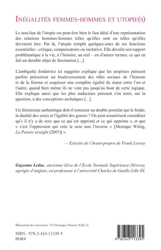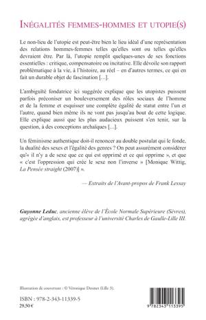 L'utopie est peut-être bien le lieu idéal d'une représentation des relations hommes-femmes telles qu'elles pourraient être. Par là, l'utopie remplit quelques-unes de ses fonctions essentielles : critique, compensatoire ou incitative. Elle dévoile son rapport problématique à l'histoire et au réel. Les utopistes peuvent parfois préconiser un bouleversement des rôles sociaux de l'homme et de la femme, et esquisser une complète égalité de statut entre l'un et l'autre. Mais un féminisme authentique doit-il renoncer au double postulat qui le fonde, à savoir la dualité des sexes et l'égalité des genres ?