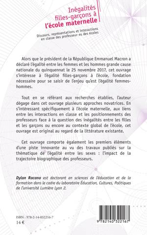 Alors que le président de la République Emmanuel Macron a déclaré l'égalité entre les femmes et les hommes grande cause nationale du quinquennat le 25 novembre 2017, cet ouvrage s'intéresse à l'égalité filles-garçons à l'école, fondation nécessaire pour se saisir de l'enjeu qu'est l'égalité femmes-hommes. Tout en se référant aux recherches établies, l'auteur dégage dans cet ouvrage plusieurs approches novatrices. En s'intéressant spécifiquement à l'école maternelle, aux liens entre les interactions en classe et les positionnements des professeurs face à la question des inégalités entre les filles et les garçons ou encore au contexte global de l'école, cet ouvrage est original au regard de la littérature existante.